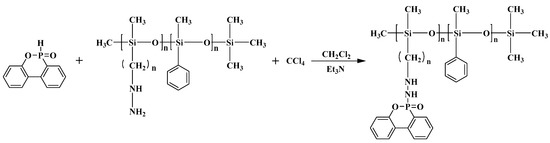 DASO was prepared through Atherton–Todd reaction between DOPO and APSO (Scheme 1). To a 250 mL three-neck flask equipped with a magnetic stirrer and a reflux condenser, DOPO (0.54 g, 2.5 mmol), APSO (24 g, 2.5 mmol), CH2Cl2 (50 mL), and triethylamine (0.25 g, 2.5 mmol) were introduced. Following that, DOPO was dissolved, CCl4 (0.385 g, 2.5 mmol) was added dropwise under stirring in an ice bath. Subsequently, the mixture was heated to 40 °C and kept the temperature for 12 h. Afterward, triethylamine salt and CH2Cl2 were removed by vacuum filtration and rotary evaporation, respectively. The crude product was dissolved in dichloromethane and washed with deionized water several times. Finally, after the removal of dichloromethane by rotary evaporation and vacuum drying at 100 °C for 24 h, it gives a yellow oily liquid (named DASO) with a yield of 91%.