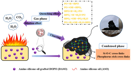 Taking the described-above flame retardant role of DASO in both gas and condensed phase into consideration, a possible flame retardant mechanism is proposed and illustrated in Scheme 2. With respect to the gas phase, nonflammable gases (H2O and CO2) dilute oxygen and flammable volatiles and work synergistically with phosphorus-containing radicals (·PO and ·PO2) as radical scavengers to capture the highly active radicals (H· and HO·) during the combustion process, further combustion is consequently slowed down. As to the condensed phase, the phosphorus- and silicone-containing fragments promote and participate in the formation of a dense and highly graphited char layer with Si-O-C and phosphorus-rich structure during the combustion, which acts as a physical barrier to inhibit the transfer of heat and flammable volatiles.