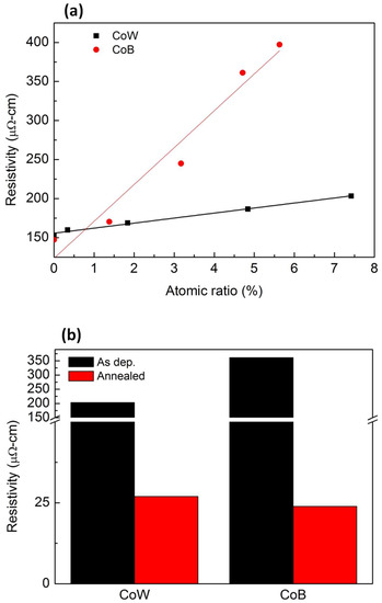 To understand the effect of the atomic ratios of M (W and B) on the level of resistivity, the resistivity values of the two CoM films with various M atomic ratios were measured. The result is shown in Figure 1a. For both the CoW and CoB films, the resistivity increased with the increasing concentration of the added alloying metal. The increase ratios were estimated to be 7.55 and 47.22 cm/atomic% for the CoW and CoB films, respectively, indicating that B has a larger impact than W in terms of increasing the resistivity of the Co films.