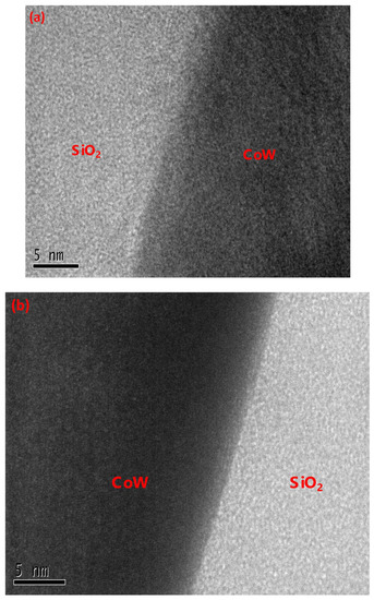 The measurements of the negative heat of WO2 and WO3 formation at 25 °C are −295 kJ/mole and −281 kJ/mole, respectively, per oxygen atom, and that of B2O3 is −421 kJ/mole per oxygen atom. The W- and B-based oxides each has a lower formation heat than does SiO2 (−455 kJ/mole per oxygen atom) [18], representing that SiO2 is more thermally stable. Hence, the W and B in the as-deposited samples could not reduce the surrounding SiO2 and form M-oxide thermodynamically. Upon annealing, the thermal energy drives the reaction between B and SiO2 to occur, thereby forming a layer of B2O3 at the CoB/SiO2 interface, as evidenced in Figure 2c. Since the formation heats of WO2 and WO3 are far lower than that of SiO2, the reaction between W and SiO2 cannot occur, even with annealing at 425 °C. As a result, no interfacial layer can be observed in the annealed CoW/SiO2 sample.