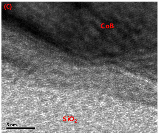 Figure 2a–c shows the cross-sectional TEM images of the CoW/SiO2 and CoB/SiO2 samples before and after 425 °C annealing for 1 h. For the as-deposited samples, both the CoW and CoB films were amorphous. Additionally, both samples had a visible interface between the CoM and SiO2 films, without the formation of an additional layer. After annealing at 425 °C, both the CoW and CoB films crystallized and were transformed into fine equiaxed grains. For the annealed CoW/SiO2 sample, the interface between the CoW and SiO2 films remained unchanged. On the other hand, after the same annealing, an ultrathin layer with an estimated thickness of 5.24 ± 0.28 nm was observed at the interface between the CoB and SiO2 films. This layer likely formed via an annealing-induced chemical interaction between B and the oxygen in the SiO2 film.