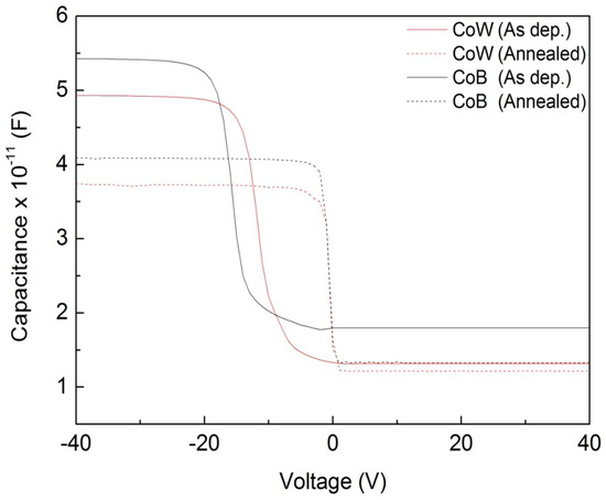 Moreover, the Vfb values of both the CoW-gate and CoB-gate MIS capacitors became ~−0.6 V after annealing. The Vfb value of an MIS capacitor is determined by the work function difference between the metal gate and the Si, provided that the used dielectric film has no charges. The theoretical work functions of p-type Si and Co are 5.25 eV and 5.00 eV, respectively [18]. Hence, the Vfb values of CoW-gate and CoB-gate MIS capacitors are estimated to both be approximately −0.25 eV. The dielectric film in the MIS capacitors is thermally grown SiO2, which reportedly has a typical fixed-charge density on the order of 1010 to 1011 cm−2. These fixed charges have been reported to be positive charges due to the form of oxygen vacancies, giving rise to a Vfb shift of approximately −0.01 to −0.1 V [24,25]. Herein, annealing caused the Vfb values of both the CoW-gate and CoB-gate MIS capacitors to reduce to −0.6 V, very close to the theoretical value. This result indicates that the sputtering-induced charges in the SiO2 film were passivated by annealing. Furthermore, annealing did not cause further negative Vfb shift, representing no diffusion of metal ions into the SiO2. This result reveals that CoW and CoB alloys can act as a diffusion barrier in advanced integrated circuits.