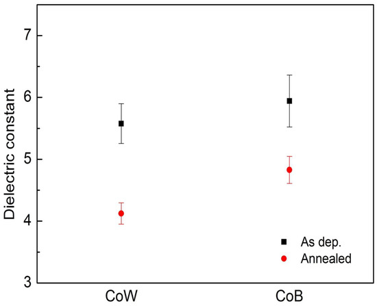 Dielectric constants of SiO2 films in CoW-gate and CoB-gate MIS capacitors before and after annealing.