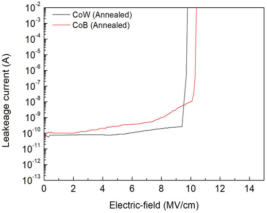 Figure 5 presents the plots of the leakage current-electric field (I-E) curves of the annealed CoW-gate and CoB-gate MIS capacitors. Ten samples were measured for each condition. From the I-E plots, the breakdown field can be determined as the leakage current suddenly increases by at least three orders of magnitude to more than 10−2 A. Before breakdown, the measured leakage current of the annealed CoW-gate MIS capacitor was ~10−10A, and it and remained unchanged with the applied field, which is similar to the behavior of the annealed Co-gate MIS capacitor [26]. For the annealed CoB-gate MIS capacitor, its current increased with the applied field and was larger than that of annealed CoW-gate MIS capacitor. This transition is likely to be the formation of the interfacial B2O3 layer, which increases the leakage current.