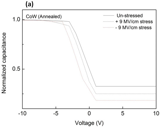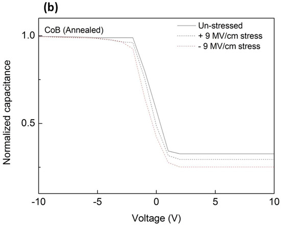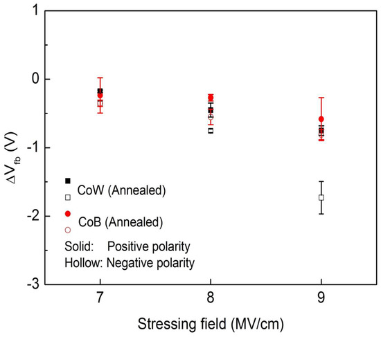 Electrical stress was applied to the annealed CoW-gate and CoB-gate MIS capacitors. After the application of electrical stress, C-V measurements were taken. Figure 6a,b show the plots of the normalized C-V curves for the annealed CoW-gate and CoB-gate MIS capacitors, respectively, after they were subjected to electrical stress at ±9.0 MV/cm for 103 s. Under both positive-polarity and negative-polarity electrical stress, the C-V cures shifted to a negative voltage direction for both the annealed CoW-gate and the CoB-gate samples. A larger shift was observed under negative-polarity electrical stress. Figure 7 summarizes the Vfb shifts as a function of the applied field for the annealed CoW-gate and CoB-gate MIS capacitors after they were subjected to electrical stress for 103 s. Whether under electrical stress with various fields in the positive- polarity or the negative-polarity, both annealed CoW-gate and CoB-gate MIS capacitors exhibited negative Vfb shifts, indicating that positive charges were introduced into the SiO2 film. The magnitude of the Vfb shift gradually increased with the increasing stress field, and it was larger with the negative-polarity electrical stress than with the positive-polarity electrical stress. Additionally, the annealed CoW-gate MIS capacitor had a larger Vfb shift than did the annealed CoB-gate sample. The Vfb shift for the annealed CoW-gate MIS capacitor became pronounced as the stress field increased to −9.0 MV/cm. Under positive-polarity electrical stress, metal ions would drift into a dielectric film, thus causing a negative Vfb shift [18,27]. As a result, the negative Vfb shift for the annealed CoW-gate and CoB-gate MIS capacitors under positive-polarity electrical stress was likely caused by the drifting metal ions. In the case of the annealed Co-gate MIS capacitor, which underwent the identical electrical stress at 9.0 MV/cm, the Vfb shift was −4.25 V, which was higher than those of the annealed CoW-gate and CoB-gate samples. This indicates that the doping element (W or B) in the Co can prevent the drift of Co ions. Comparing the annealed CoW-gate and CoB-gate samples reveals that the latter had a smaller negative Vfb shift, indicating better resistance to prevent the migration of metal ions. This prevention is attributed to the formation of an interfacial B2O3 layer in the annealed CoB-gate sample.