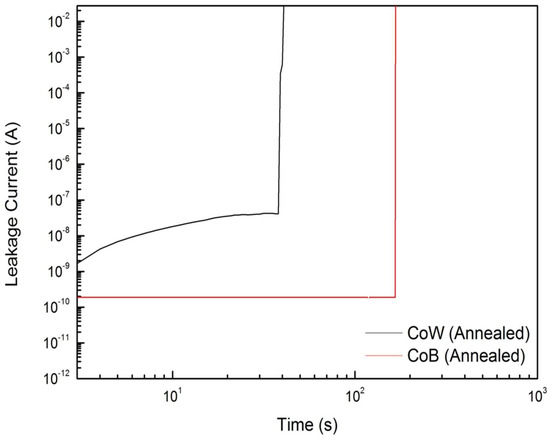 Time-dependence-dielectric-breakdown (TDDB) tests were carried out to evaluate the long-term reliability of the annealed CoW-gate and CoB-gate MIS capacitors. In a TDDB test, negative-polarity electrical stress was continuously applied to the metal gate of an MIS capacitor, and the response leakage current was continuously monitored with the stressing time. Figure 8 shows the plots of the leakage current versus the stressing time (I-t) for the annealed CoW-gate and CoB-gate MIS capacitors during the TDDB tests. The MIS capacitors with different metal gates exhibited very different characteristics in the I-t curves. The curves from the annealed CoW-gate sample showed that the current increased with the stressing time and then suddenly jumped (i.e., broke down). This gradually increased current is attributed to charge trapping in the SiO2 layer. As the number of trapped charges reaches the critical value, breakdown occurs due to the formation of a conduction path. In contrast, the curves from the annealed CoB-gate sample had almost flat I-t curves, suggesting that no charges were trapped in the SiO2 layer. The differences in behavior of the I-t curves for the annealed CoW-gate and CoB-gate MIS capacitors are likely to be caused by the CoM/SiO2 interface. The interfacial B2O3 layer is formed in the CoB/SiO2 structure after annealing. This layer helps to prevent charge-trapping in the SiO2 layer.