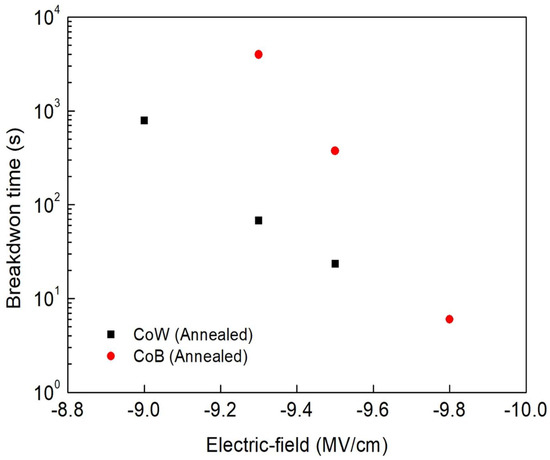Figure 9 shows the plots of the breakdown times (tbd) of the annealed CoW-gate and CoB-gate MIS capacitors as a function of the stressing electric-field. The breakdown times of both the annealed CoW-gate and CoB-gate MIS capacitors decreased with increases in the applied field, indicating that the field plays an important role in controlling dielectric breakdown. Comparing the breakdown times of the annealed CoW-gate and CoB-gate MIS capacitors reveals that the latter sample had longer breakdown times, similar to the results of the breakdown field. The formation of a thick interfacial B2O3 layer and fewer electric-stress-induced charges in the annealed CoB-gate MIS capacitor are believed to be responsible for the enhanced TDDB reliability.