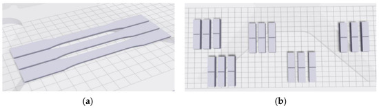 Allocation of test sample models on the 3D printer’s workspace in the environment of the Eiger software: (a) tensile test samples; (b) Charpy impact test samples.