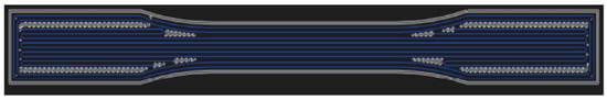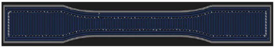 Next, a sample with a fiber orientation at an angle of 0° (Type B) was made (see Figure 2). On the other hand, the next sample (Type C) had the fibers oriented at an angle of 90° (see Figure 3). In order to compare the samples, carbon-fiber-free samples were also made out of Onyx material only. These samples were made as: Full Core Solid Fill 100% (Type D) and Infill Triangle Network 37% (Type E).