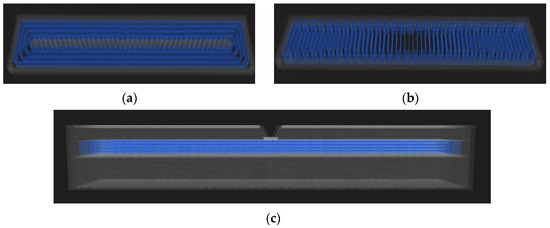 As also mentioned before, in order to scan the parts and observe the deposition of fibers in the matrix, the Zeiss METROTOM 1500 computed tomography system was used. As it is well known and has been stated in [42], computed tomography is one of the best non-destructive methods for evaluating the internal structure of materials. In addition, at present, this measuring method is increasingly used and is compared with coordinate measuring machines and their techniques; for example, the authors in [43,44,45] clearly pointed out the benefits of applying computed tomography measurements over other methods.