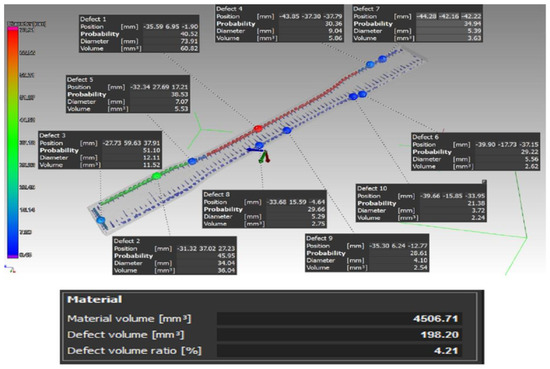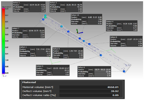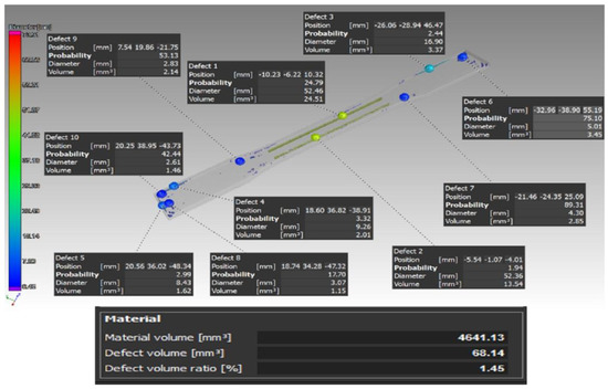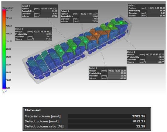 In a similar way, the samples for undergoing the Charpy impact test were also scanned. All of the samples were made by the triangular infill strategy with the exception of the type D sample. For this reason, the detected defect values in volume were also high. Due to the use of this type of strategy, it was not possible to evaluate the effect of fiber deposition on the volume of defects in the impact test specimens. Figure 9 shows a type B sample scan before the sample was submitted to the impact test.