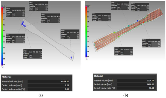 A general view on the distribution of the defects and their volume in the case of the samples without carbon fibers: (a) type D sample; (b) type E sample.