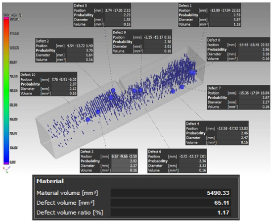 The percentage of defects in the individual samples of type A was A1—0.85%, A2—0.47%, and A3—0.71%; these percentages relate to the whole sample volume.