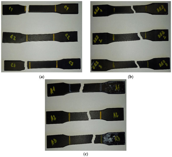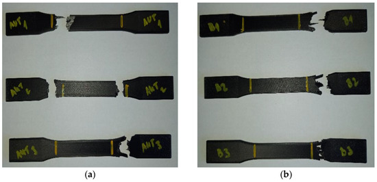 As it can be appreciated in the whole of Figure 11 and in Figure 12a, the samples did not usually break in the narrowest part of the sample between the two yellow lines. This phenomenon was caused by the placement of the filament in the matrix during or when executing the calculations in the Eiger software. More specifically, this was caused when setting the printing parameters. When calculating the paths, the software is not always able to place fiber in all spots, due to the same shape of some parts, and then an uneven distribution of the fibers can, in consequence, take place. This issue may lead to having places without reinforcement in the part, which, of course, results in the weakening of these areas or places and, thus, in the subsequent failure of the sample.