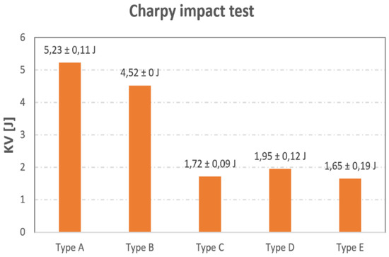 The Type B sample also saw approximately a 2.3 times increase in the work required to break. As in the tensile test, the authors can state and conclude that the fiber-reinforcement and their orientation did indeed affect the mechanical properties of the composite. On the other hand, in the case of the type C sample, a decrease of 0.23 J in terms of work was observed. This, like in the case of the tensile test specimens, was due to the unsuitable orientation of the fibers with respect to the direction of the applied force. This, in addition, may also be related to the adhesive characteristics of the fiber and the base material in the production of the samples themselves, which may have led and may indeed lead to delamination as also covered in [62]. Similarly, the decrease in work in the case of the type E sample (Infill 37%) was due to the different fill density compared to the type D sample (Solid Fill 100%). Figure 16 offers a general take on the tested samples of individual types A–E.