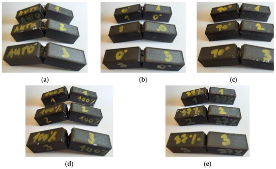 As for Figure 12b,c, the type D and E samples broke where they were expected to break. The slight offset from the center of the part could have been caused by various factors, e.g., layer thickness, melting temperature, printing speed, and infill geometry. Another factor is the same fact that the Onyx material is a micro-carbon-fiber-filled nylon.
