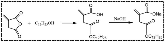 The preparation procedure for the reactive emulsifier is shown in Figure 1. Firstly, a mixture of lauryl alcohol (1 mol) and itaconic anhydride (1 mol) was stirred at 80 °C for 4 h in a 250 mL, four-neck, round-bottom flask with a reflux condenser. It was then cooled to room temperature. The product was recrystallized with absolute ethanol to obtain lauryl itaconic acid monoester (LIA) with a yield of over 90%. Finally, LIA was dissolved in water and neutralized with a sodium hydroxide solution. After freeze-drying, the reactive emulsifier (C12-Na) was obtained.
