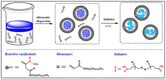The nanoemulsions were prepared via mini-emulsion polymerization with a solid content of approximately 20%. The preparation route is shown in Figure 2. The monomer LA or SA was firstly added to the aqueous C12-Na solution and agitated at 30 °C for approximately 30 min. The resultant emulsion was sonicated using a BILON-500 Ultrasonic signal generator (Bilon Instrument Co. Ltd. Shanghai, China) at a 90 W intensity for 30 min to obtain the mini pre-emulsion.