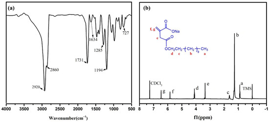FT-IR and 1H NMR were used to characterize the structure of the reactive emulsifier, C12-Na. The FT-IR spectra of C12-Na are represented in Figure 3a. The bands at 2916 cm−1 and 2851 cm−1 were due to the presence of -CH3 and -CH2 in the C12-Na. The band at 1726 cm−1 was assigned to the stretching vibrations of the -C=O. The band at 1634 cm−1 was due to the -C=C- stretching vibrations, the band at 1166 cm−1 was assigned to the -C-O-C- stretching vibrations, and the band at 720 cm−1 was attributed to the bending vibration band of -(CH2) n. The 1H NMR of the C12-Na is shown in Figure 3b: σ 0.87~0.89 (3H, a-H); σ 1.25~1.30 (18H, b-H); σ 1.58~1.64 (2H, c-H); σ 3.34 (2H, e-H); σ 4.08~4.11 (2H, d-H); σ 5.83 (1H, f-H); and σ 6.46 (1H, g-H). The results confirmed that the structure of the prepared products were the target compounds [21].