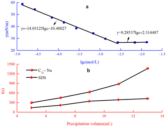 The surface tension of the C12-Na was measured to evaluate its surface activity. The surface tension of the C12-Na solution as a function of the logarithm of surfactant concentration is shown in Figure 4a. The critical micellar concentration (CMC) of the C12 -Na could be obtained from the intersection of two lines after linear fitting. The prepared reactive emulsifier, C12-Na, demonstrated high surface activity with a CMC of 2.34 mmol/L, and the surface tension at CMC was 26.61 mN/m. The emulsifying capacity can be evaluated by the time it takes to release the same volume of liquid using a water-segregating method [22]. The longer the time needed to precipitate the same volume, the better the emulsification performance of the surfactant is. The emulsification power of C12-Na and SDS are shown in Figure 4b. When the same volume of water was precipitated, the time required for C12-Na was greater than that for SDS. This indicates that the emulsification power of C12-Na was superior to the emulsification power of SDS.