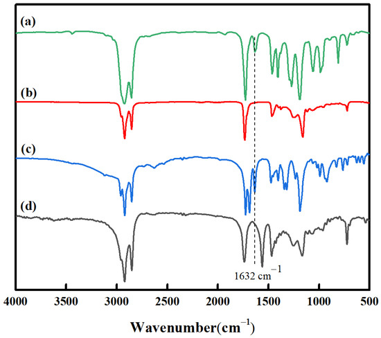 The FT-IR spectra of LA, PLA, SA, and PSA are shown in Figure 5. The bands at 2926 and 2824 cm−1 were from the stretching vibrations of -CH3 and -CH2. The bands at 1732 cm−1 were attributed to -C=O stretching vibrations. The bands at 1401 cm−1 and 1454 cm−1 were due to -CH3 bending vibrations, while the band at 1161 cm−1 was attributed to the -C-O-C stretching vibration. In the spectra of LA (Figure 5a) and SA (Figure 5c), the bands at 1634 cm−1 were assigned to the characteristic absorption of -C=C. This peak was absent in the spectra of PLA (Figure 5b) and PSA (Figure 5d), which suggests that the acrylic monomers reacted completely and the polymers were formed through the addition across the vinyl bond.