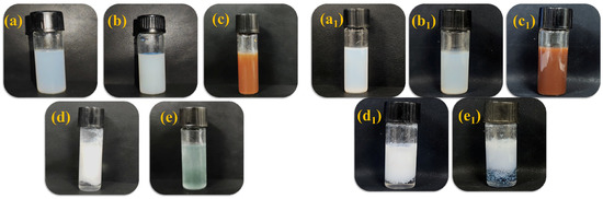 Stability of PLA (left) and PSA (right): (a,a1) 1:9 dilution, (b,b1) centrifugal, (c,c1) tanning extract, (d,d1) acids, and (e,e1) chromium salt.