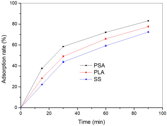 The absorption rate of PLA and PSA was evaluated by measuring the TOC content of float before and after fatliquoring at a pH of 4~4.5. A plot of the absorption rate of the fatliquoring agents versus running time is shown in the Figure 8. As is shown in Figure 8, the absorption ratios of the PLA, PSA, and sulfonated oil (SS) all increased with the running time. After 90 min, the absorption rates reached 92.62%, 98.13%, and 87.47%, respectively. The absorption ratios of PLA and PSA were higher than that of the conventional fatliquor, SS. This is because the carboxyl groups in the PLA and PSA could coordinate with chromium, which imparted them with a better affinity for the chrome-tanned leather; therefore, they were absorbed more into the leather.