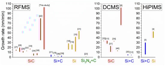 SiC, Si, and C (graphite) are most often used as targets in magnetron sputtering experiments. Some studies have been carried out with Si3N4 [23] and segmented Si+C targets [25,26]. The power applied to the targets in conventional RF and DC MS processes varies over a wide range of 80 to 600 W, while, in the HiPIMS process, it is much higher (up to 1400 W). In many cases, the formation of SiCxNy films is achieved by the reactive sputtering of these targets in argon-nitrogen media. The sputtering of a single silicon target is accompanied by the presence of a hydrocarbon gas such as CH4 or C2H2. The authors of the works mentioned in the Table 1 showed the possibility of varying the composition of SiCxNy films over a wide range through the use of different amounts of reactive gases (N2, CH4 or C2H2) during sputtering. It is known that the addition of gaseous nitrogen to the reaction chamber is an effective method for the dosed introduction of nitrogen into the film composition. As can be seen from Table 1, the most common reactive gas used in the sputtering processes is nitrogen. The introduction of N2 into the gas mixture leads to an increase in the nitrogen content of the SiCxNy films of up to 40 at.% [9]. A similar effect of the addition of nitrogen-containing gas on the composition of SiCxNy films is also shown for CVD films [1]. As follows from the literature, most of the films were obtained at room temperature (RT). There is a very limited number of works in which the authors have used elevated deposition temperatures of up to 700 °C [23]. Different authors used different experimental setups, target materials, target–substrate distances, levels of applied power, reactor chamber geometries, reactive gases, and flow rates; therefore, all of the above leads not only to difficulties in comparison, but to the potential for the comparison of results not to be scientifically perfect. Nevertheless, it is interesting to draw at least some correlations. To compare the influence of various magnetron sputtering processes and types of sputtered targets on the SiCxNy films’ growth rates, we summarized the results reported in the literature in Figure 1. Considering that the growth rate depends critically on the target–substrate distance, it would be useful to add another axis with these data. Unfortunately, the target–substrate distance is almost impossible to deduce in a large number of articles (Table 2). It should be noted that, in most studies, the growth rate does not exceed 30 nm/min. A high growth rate of up to 80 nm/min was obtained during the RF magnetron sputtering of an SiC target, where the target–substrate distance was 25 mm [22].