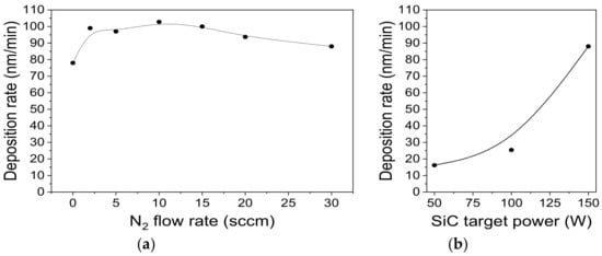 (a) Deposition rate of films versus nitrogen flow rate (series A); (b) Film growth rate as a function SiC target power (series B).