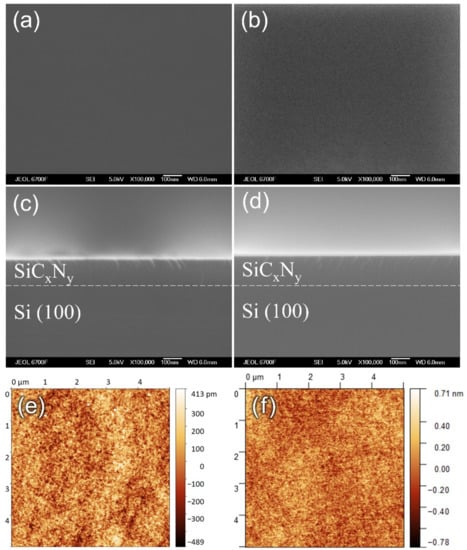 The surface morphologies of SiCxNy films grown on Si(100) substrates were characterized using SEM. The films’ surfaces were a very smooth, without any notable features (Figure 3a,b).