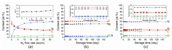 (a) The dependence of the elemental composition and the ratio of Si/C elements (insert) in SiCxNy films on the nitrogen flow obtained at room temperature (series A). The element contents in SiCxNy films obtained at (b) F(N2) = 0 and (c) 30 sccm over time during five months. The insets in (b,c) shows the elemental composition during the first storage days.