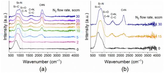 Films synthesized at RT by the MS of the SiC target in an argon medium without nitrogen addition are characterized by the presence in the spectrum (Figure 5a) of the band of Si–C stretching vibration in silicon carbide at 790 cm–1 [52]. The addition of even an insignificant amount of nitrogen to the gas phase (F(N2) = 2 sccm) leads to a shift of the baseband to the region of large wave numbers and to its broadening, which corresponds to the appearance of bonds between silicon and nitrogen. The observed wide absorption band in the range of 700–1200 cm−1 is the typical one for Si–C–N films [1]. It can be interpreted as the superposition of bonds such as Si–C, Si–N, C–N, and Si–O. The bands at 790 and 950 cm−1 correspond to Si–C and Si–N stretching vibrations, respectively [52]. Absorptions in the regions of 1055–1400 cm–1 and 1020–1100 cm–1 are attributed to the vibration of the C–N and Si–O bonds, respectively [1]. A further increase in the nitrogen flow rate causes the appearance in the FTIR spectra and the increase in the intensity of the peaks at 1550–1600 and 2200 cm–1. The first broad band is believed to correspond to C=N and/or C=C stretching vibration modes. The vibration frequencies of the doubly bonded groups are very close, so the separation of these groups is quite problematical [1,52]. The band in the 2200 cm−1 region corresponds to the stretching vibration of the carbon–nitrogen triple bond C≡N [1]. This fact indicates the formation of a larger number of bonds between nitrogen and carbon atoms with an increase in the nitrogen flow rate. Thus, in general, the inclusion of nitrogen atoms in the film with the rise of F(N2) occurs due to the formation of bonds by nitrogen atoms with both silicon and carbon atoms. The evolution of the FTIR spectra of the films obtained at 300 °C is similar (Figure 5b). Similar behavior of the double and triple bonds of carbon and nitrogen in the FTIR spectra of the SiCxNy films obtained by magnetron sputtering has been observed in [7,8,27,53].