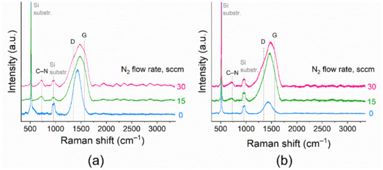 For more information on the composition of the films, Raman spectra were recorded. This technique is employed to extract the structural information and the presence of carbon as an additional phase. The Raman spectra of SiCxNy films, obtained at different values of the nitrogen flow rate at room temperature and 300 °C, are shown in Figure 6.