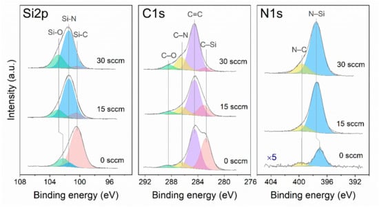 Figure 7 displays the evolution of the Si2p, C1s, and N1s core-level spectra with nitrogen flow rate.