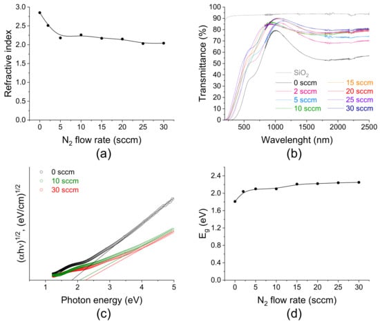 Optical properties of SiCxNy films deposited at various nitrogen flow rates (series A): (a) refractive index, (b) transmittance, (c) Tauc plots versus photon energy with linear approximation and (d) band gap energy.