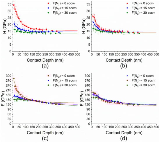 Hardness (a,b) and elastic modulus (c,d) of SiCxNy samples as functions of the indenter penetration depth at the different nitrogen flow rate. Tdep = RT (a,c) and 300 °C (b,d).
