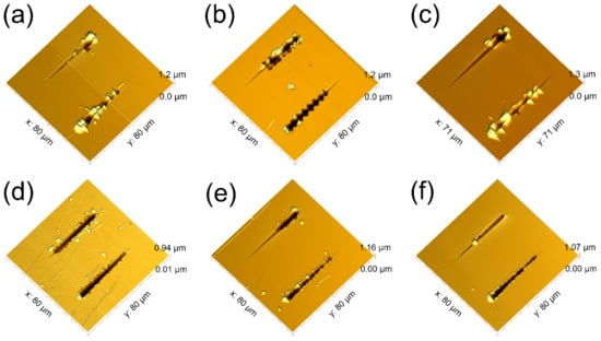 AFM images of scratches on the surface of SiCxNy films obtained at (a,b,c) room temperature and (d,e,f) 300 °C and nitrogen flow rate of (a,d) 0, (b,e) 15 and (c,f) 30 sccm.