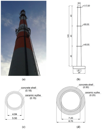 The analyzed chimney (the prototype): (a) The general view; (b) the main vertical dimensions [m]; (c) the dimensions of the cross-section at the top [m]; (d) the dimensions of the cross-section at the bottom [m].