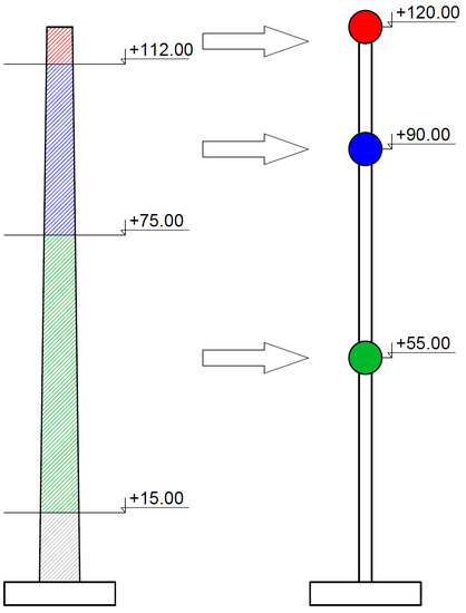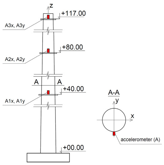 The dynamic characteristics of the chimney, i.e., natural frequencies and damping properties, were estimated through the field test. The experimental set-up consisted of three high sensitivity (10,000 mV/g) accelerometers (393B12 PCB Piezotronics) placed on the shaft of the chimney at a height of +40, +80, and +117 m. The accelerations were registered along the orthogonal axes X and Y of the chimney. The layout of the measuring points is shown in Figure 5.
