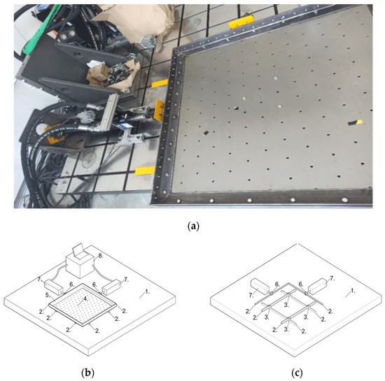(a) The general view of the shaking table; (b) the scheme of the table; (c) the scheme of the support (1—the steel foundation; 2—the linear guides; 3—the carriages; 4—the operating platform; 5—the stiffening steel frame; 6—the actuator’s head on the linear carriage; 7—the hydraulic actuators; 8—the steering system).