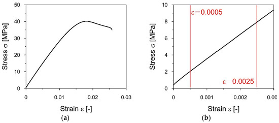 The strain−stress curve for the A1 specimen obtained from the tensile static test: (a) The whole registered experiment; (b) the detail of the curve used to determine the elasticity modulus.