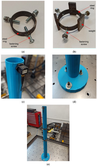 However, when the discrepancy between the numerical and experimental natural frequencies is significantly above the acceptable limit, a tuning of the numerical model has to be performed. The first tunning attempt of the FE model of the mockup, according to the authors’ experience, should concern the location of additional masses in the FE model. The location of the additional mass in the numerical model must strictly correspond to the location of the masses in the 3D printed model. The ring-to-shaft connection in the mockup is achieved by three screws (see Section 3.3.2). The points of contact of the screws with the model determine the positions of additional masses. However, the lower edge of the ring may adhere to the shaft of the mockup, which indicates that the actual location of the additional mass is different from the assumed one. The mislocation of additional masses in the FE model may result in unacceptable inconsistency of experimental and numerical frequencies.