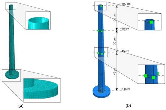 The FE model of the mockup is shown in Figure 19a. About 14,500 finite elements were incorporated into the model. The structural components of the chimney (the shaft and the foundation) were modeled with 8-node linear brick elements C3D8R (3 degrees of freedom in node, reduced integration with hourglass control).