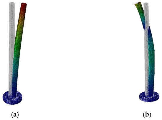 Based on the mechanical properties determined from the material properties investigation, some advantages and disadvantages of using the PLA-IMPACT material to produce models for shaking tables can be discussed. Based on the results presented in Section 3.1, it can be observed that the modulus of elasticity of the PLA-IMPACT material does not differ significantly for various directions of lamination. This observation is of great importance when it comes to 3D printing models of tall structures, such as chimneys. The chimney model could only be printed in a spiral manner with the horizontal direction of lamination. No other direction of printing was technically possible. The presented results prove that the direction of lamination has no significant effect on the modulus of elasticity of the material. Therefore, in the calculations of the model printed from the PLA-IMPACT material, the values of the material’s modulus of elasticity can be used regardless of the direction of lamination.