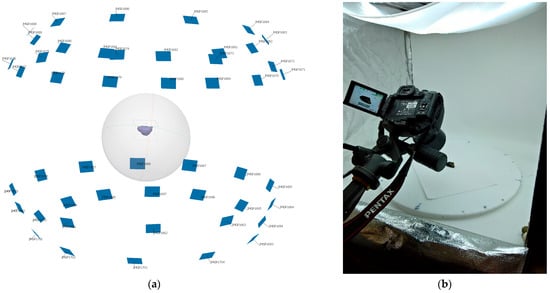 (a) Screen capture from AGI Soft Metashape, (b) turntable setup.