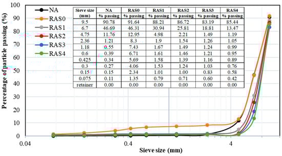 The effect of screening on the particle size distribution of RA was investigated and compared with NA. In general, the proper size distribution reduces the voids in the concrete matrix and decreases cement consumption. Therefore, well-graded RA would enhance the strength properties and durability of SCC. The particle size distribution graphs of NA and unscreened and screened RA are shown in Figure 4. There was a distinct grading trend for unscreened and screened RA. The size distribution of the RA with varying numbers of screenings was remarkably comparable. The graph also reflected that nearly half of the NA and unscreened RA samples could pass through a 6.7 mm sieve, whereas only 30% of the screened RA (RAS1) sample could, and the proportion declined as the number of screenings increased. According to the particle size distribution curves, the unscreened RA has a greater percentage of fine particles, which would result in higher water absorption and, as a result, lower workability [].