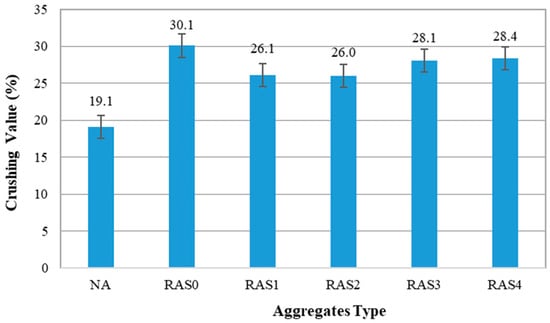 Crushing value is a crucial metric for aggregate strength and, as a consequence, concrete mechanical performance. Figure 5 shows that the average aggregates crushing value outcomes for NA and RA with varying numbers of screenings. The crushing values obtained for RA samples were higher than for NA samples, indicating that RA had lower strength and toughness than NA. On the other hand, crushing values of screened RA samples are well within AS 1141.21’s standard limits (20–30%). The crushing value of NA was 19.1%, while it was 30.1% for RAS0 (unscreened RA). Screened RAs, on the other hand, had lower crushing values than unscreened RAs and were closer to the NA. The crushing values for RAS1, RAS2, RAS3 and RAS4 were 26.1%, 26.0%, 28.1% and 28.4%, respectively. The results reveal that once or twice screening would provide the best crushing value. The crushing values of RAS1 and RAS2 increased by up to 25% in comparison with RAS0. This implies that the strength and toughness of the RA can be increased after once or twice screening by removing adherent mortar from the surface of RA. Similar crushing value improvements can be found when recycled aggregates were mechanochemically treated []. The crushing value of 28.1% and 28.4% were obtained for RAS3 and RAS4, respectively. As the number of screening increases, the resistance to crushing decreases. It is possible that some of the RAs were rather damaged during the screening process due to excessive vibration. Hence, the number of screenings should be optimised to avoid any damage or loss of mechanical properties of RA.