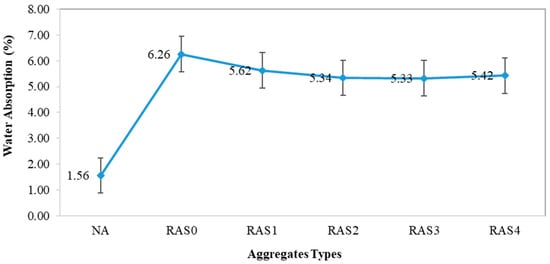 The water absorption of all samples, including NA and RA with the different screening numbers, is shown in Figure 6. The water absorption of NA was 1.56%. As expected, a higher water absorption obtained for RA with the different screening numbers ranged from 5.33% to 6.26%. The high water absorption of RA is because of the surface characteristics of RA and the attached old cement mortar paste []. As all the screened RA samples showed a higher water absorption value than the NA sample, the incorporation of RA in a saturated surface dry (SSD) state is proposed for the SCC production that also suggested by Saravanakumar et al. []. The results showed that one-time screening reduced the water absorption of the aggregates by 10.2% when compared to the unscreened aggregates (RAS0). Removing the associated mortar from the RA’s surface causes the water absorption value to drop after screening. The screening up to twice showed improvement in the water absorption results. However, further screening (three and four times) did not significantly reduce the water absorption of the aggregates. Similar to the findings reported by previous studies [,,], the unscreened RA has the lowest density, maximum porosity, and highest water absorption than NA and screened RA, owing to more adhered mortar.