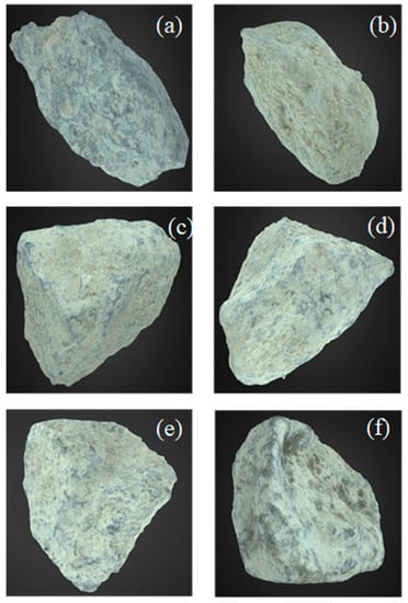 A 3D model was constructed from random RA samples after each screening stage to qualitatively reveal the effectiveness of screening. The models were built from photographs (typically 48) taken with a 24-megapixel digital SLR camera (ISO100, F32, 0.5-s shutter speed). The samples were mounted on a manual turntable inside a light tent to obtain multiple angles in diffuse lighting. Raw images were processed with AGISoft Metashape (version 1.55) to generate the 3D mesh and textures. Mesh detail varies from 300,000 faces to over 2,000,000 depending on the surface complexity and size of the sample. Figure 2 illustrates the screen capture from AGISoft Metashape. The mesh surface of the model is in the centre of the image in purple colour, and blue rectangles represent focal plane positions.