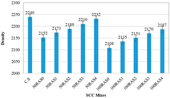 The average density of all SCC mixes, including control mix and mixes with unscreened and screened RA, is shown in Figure 8. Generally, the RA-SCC mixes had a lower density than the control sample (C.S) due to the decreased density of RA compared to NA. The mix with unscreened RA (100RAS0) had the lowest density of all the samples. Since RA is less dense than NA, the density of the SCC mixes dropped as the RA replacement percentage increased. With full or partial RA replacement, however, screening treatment increased the density of RA-SCC mixes. The density variation of 50RA mixes with partial replacement of RA with various screening numbers was 3.9%, 2.9%, 2.2%, 1.3% and 0.4% compared to C.S. Among all screened RA, the 50RAS4 mix sample had the lowest density variation with a value of 0.4%. The reason for this is that by increasing the number of screenings in SCC mixes, the density would increase due to the elimination of old and porous mortar. Similar to mechanically treated method [], screening method would enhance the overall microstructural and density characteristics of the matrix.
